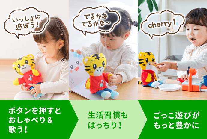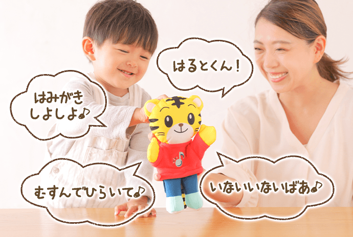 自分と一緒に頑張る存在のしまじろうパペット。言葉のやりとりやごっこ遊びをすることで、おうちのかたとお子さまのやりとりがよりスムーズになります。