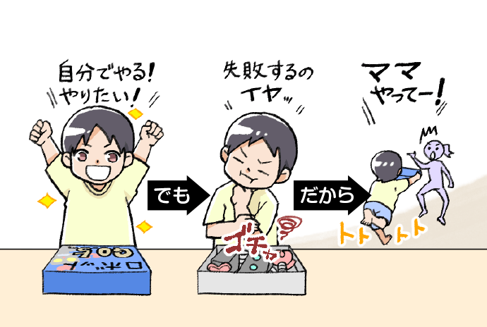 …でも、「ひとりで集中」するのはなかなか難しいのが現実。幼児期は「自分でやりたい!」と思う気持ちと「失敗したくない…」の気持ちが葛藤する時期です。 その結果おうちのかたに「やって!」とつい言ってしまうのです。