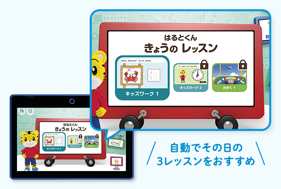 年長さん専用タブレット教材で、おうちのかたがつきっきりで声をかけなくても、学習の最初から最後まで学びをサポートします。