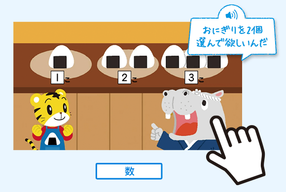 言われた個数に合ったおにぎりをタッチして確かめるなどの動作をお子さま自身が行うことで、数の概念を理解していきます。