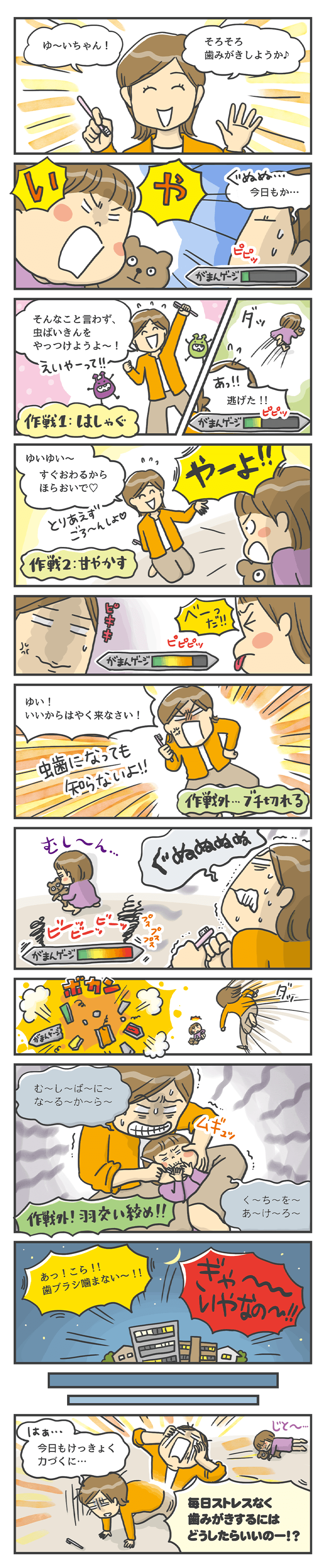 お子さまのイヤイヤが強いと、おうちのかたも力が入って悪循環に陥りやすくなります。新しい方法を試すことで、親も子も気分を変えて、楽しく取り組めるようになるといいですね。 リラックスして誘うと、子どもの抵抗もやわらぎます。イヤイヤが強い時期は、短い時間でもみがければいいという気持ちで乗り切りましょう。