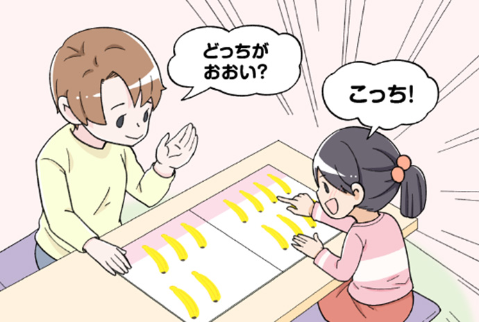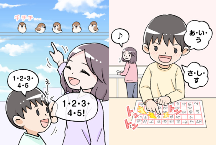 2・3歳の今は、遊びや親子のやりとりの中で「聞く・話す」体験や数量感覚を育む体験をたくさん積み重ねましょう。そのうち「もじ・かず」を使いたい意欲が自然に高まり、この先の学習につながります。