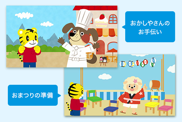 興味をくすぐる身近な題材のストーリーをきっかけに、ひらがな・数・プログラミングなどさまざまなテーマの学びに取り組めます。