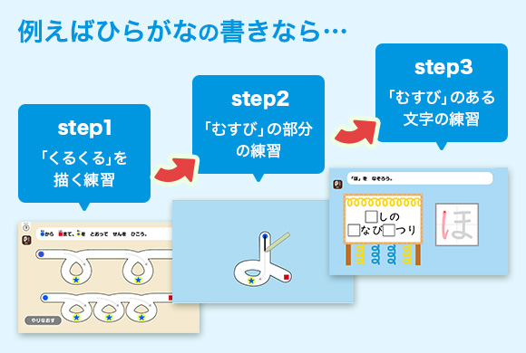 まだ書くことに慣れていないお子さまでも取り組みやすいよう、はじめは運筆練習や画数の少ない文字からスタートし、少しずつレベルアップ。