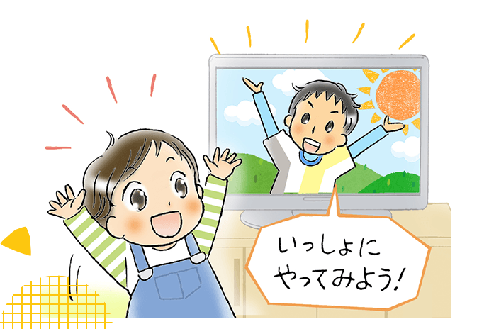 お子さまが興味をもつには「自分もやってみたい」と思うことが大切です。 楽しそうと感じられるキャラクターや登場人物がいることで、まねっこをしてみたいと思えるようになります。