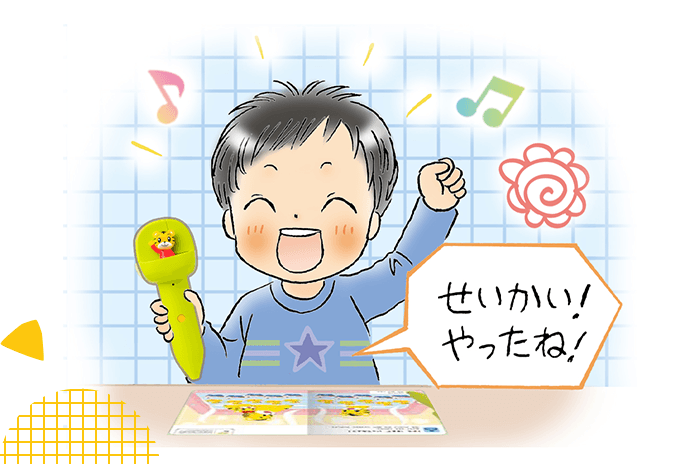 遊び方がわかりやすいワーク誌面と、ペンでタッチすると流れてくる音声で、お子さまひとりでも楽しく進められます。