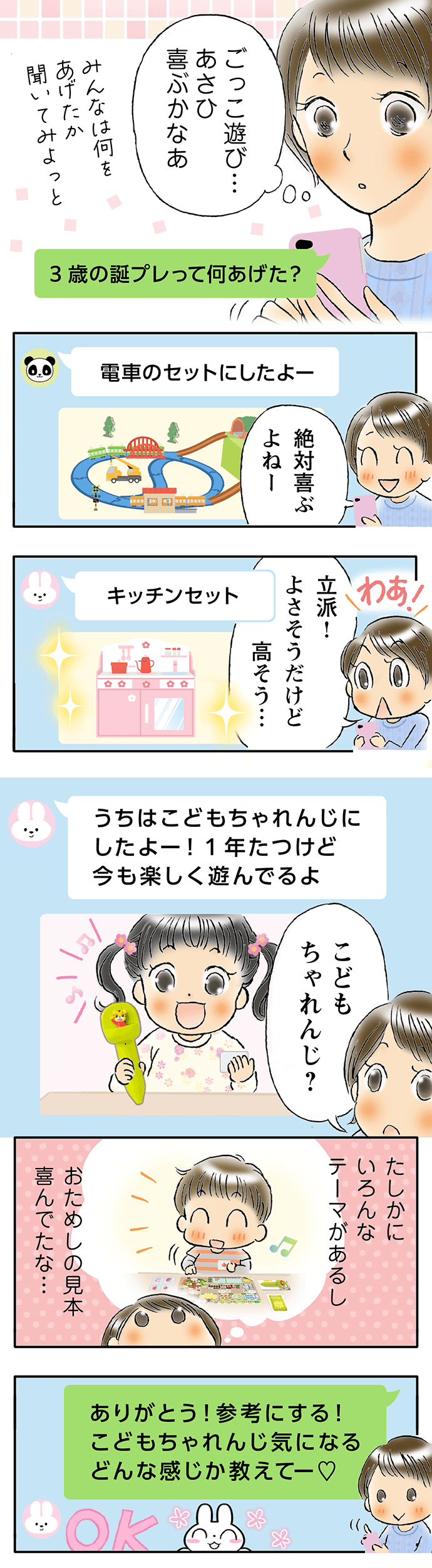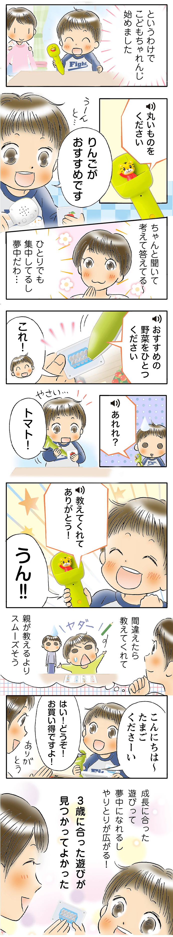 お子さまにとって身近なテーマは、想像しやすく、やりとりが広がりやすいもの。遊びの中でやりとりを再現することで、言葉の使い方やふるまいを身につけられます。