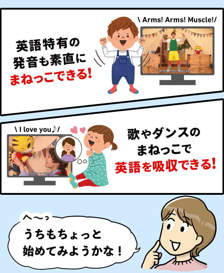 効果につなげるために「興味をもって英語を聞けること」が大切と言われています。年齢に合わせた遊びや映像でサポート、日本語でのフォローをするなど、積極的に耳を英語に傾ける工夫が必要です。