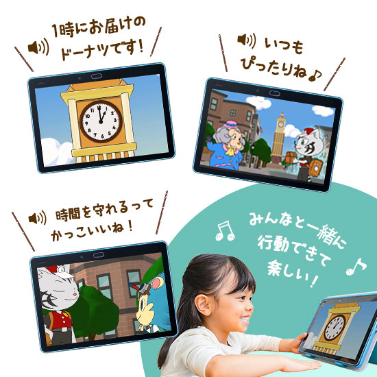 アニメで仲間と一緒に「とけいが読めるようになりたい!」気持ちを盛り上げます