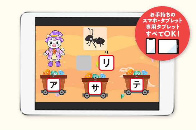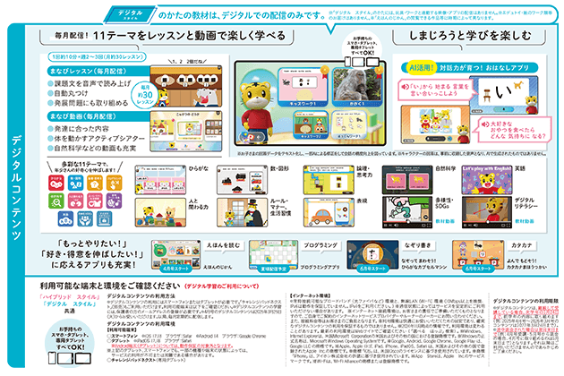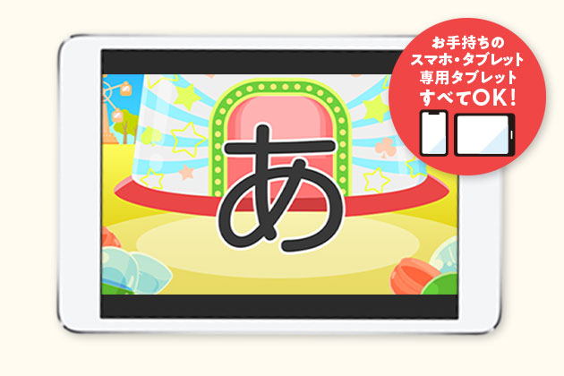 ひらがな・カタカナの読み書きアプリ(6月号~)、電子えほんアプリなど、お子さんの興味にあわせて学べます。