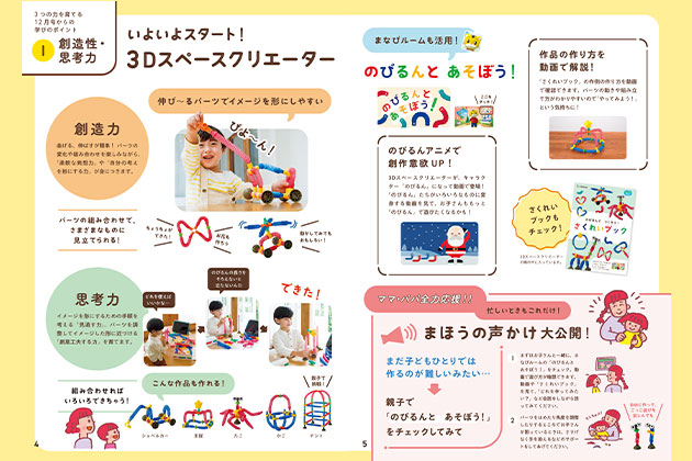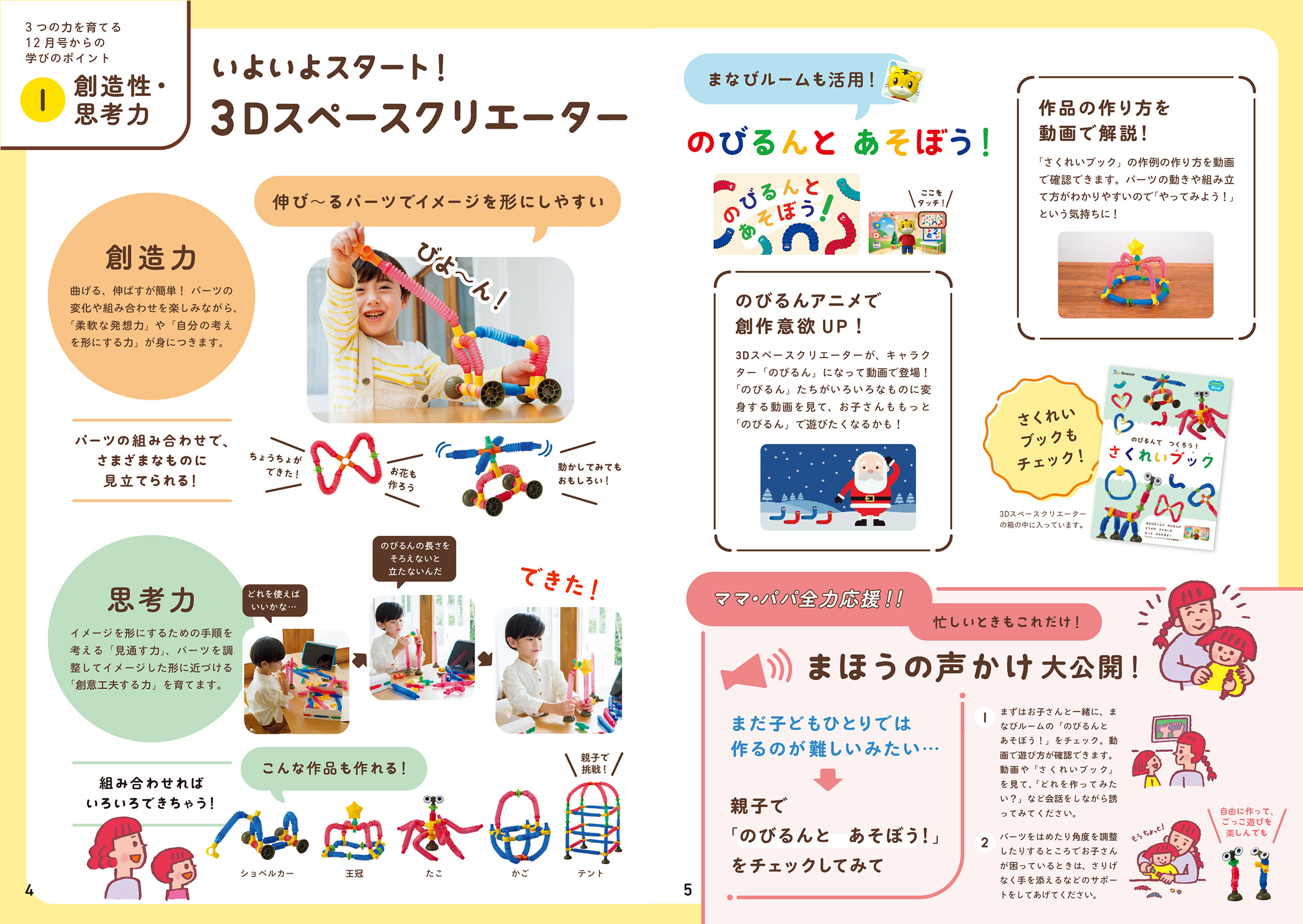 エデュトイや紙ワークを中心に、〈こどもちゃれんじ ほっぷ〉12月号では「3Dスペースクリエーター」をお届けします。伸ばしたり縮めたりできる様々なパーツを組み合わせて、自分だけのオリジナル作品を作りましょう。