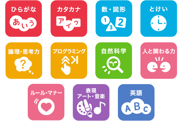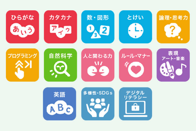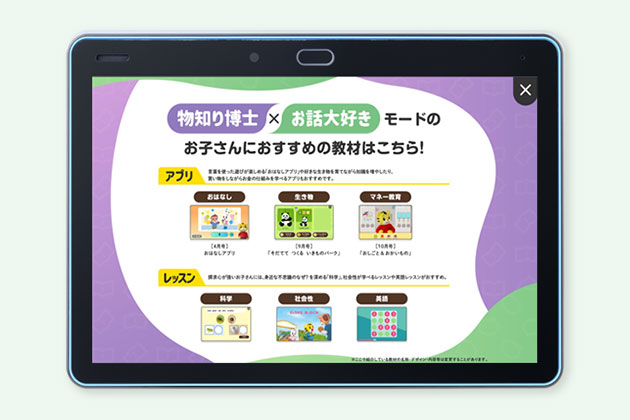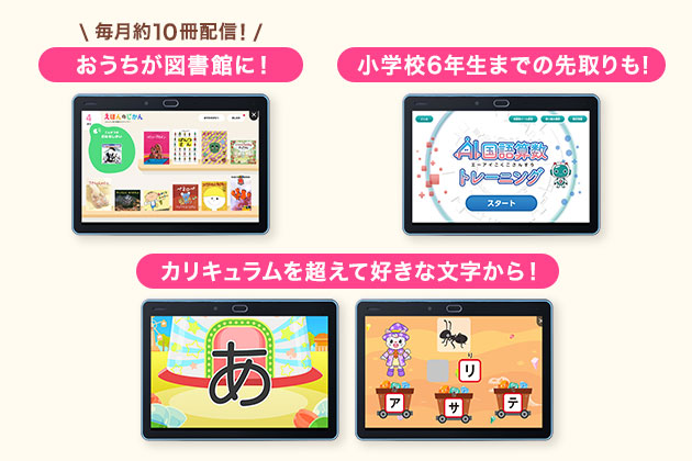 ひらがな・カタカナの読み書きアプリ、電子えほんアプリなど、お子さんの興味にあわせて学べます。