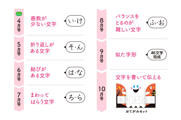 迷路や宝探し、探偵ごっこなどを楽しむ中でひらがなをなぞり書き。「文字で伝える楽しさ」にもたっぷりふれながら、きれいな文字が書けるようになっていきます。