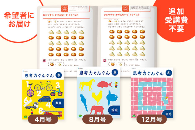 「ハイブリッド スタイル」の場合のお届け教材は、キッズワーク(年6回・2号分ずつ)、エデュトイ(年3回)、「思考力ぐんぐん」(年3回・ご希望のかたのみ)となります。