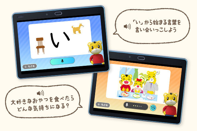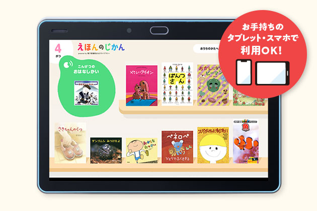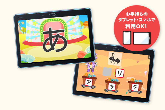 ひらがな・カタカナの読み書きアプリ、電子えほんアプリなど、お子さんの興味にあわせて学べます。
