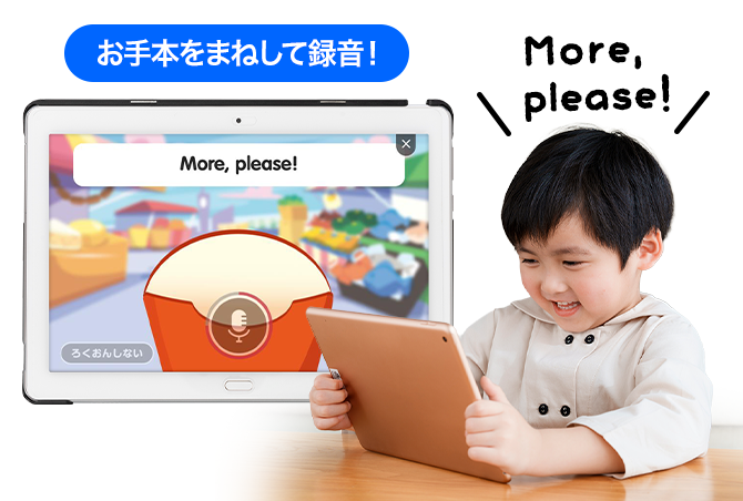 英語を聞いたまま、まねして発語できる録音レッスンもご用意!楽しく発語する体験を通して、英語を話す力を育てます。