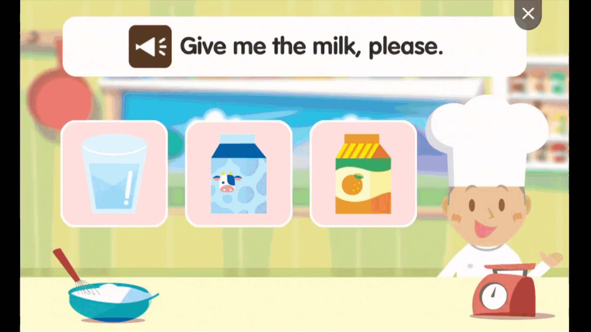 買い物ゲームで遊び”..., please!”や果物の英単語を身につけたり、こんなときなんていう劇場では”Help me, please!”の使用シーンを理解できたりします。